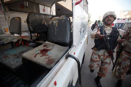 A Rangers soldier tries to stop media personnel, near a vehicle with blood stains on a seat, after a bomb attack in Karachi