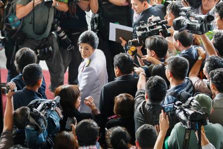 Thailand's Prime Minister Yingluck answers questions from the media as she leaves a meeting with the Election Commission in Bangkok