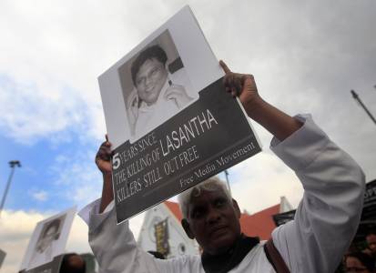 A Catholic priest holds up an image of journalist Wickrematunge during a protest against what demonstrators said are the killing and abductions of local journalists, in Colombo