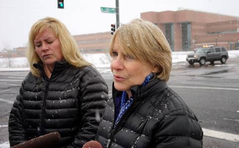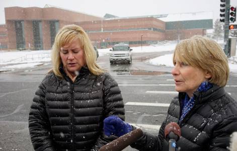 Cheri Spottke (L), an investigator with the Westminster Police Department, listens as Lynn Setzer, public information officer for Jefferson County schools, talk to the media outside Standley Lake High School in Westminster January 27, 2014. A 16-year-old student set himself on fire in the cafeteria of the suburban Denver high school on Monday in what police said was an apparent suicide attempt and they evacuated the campus. The student at Standley Lake High School in the suburb of Westminster suffered burns over 80 percent of his body, according to a spokeswoman for the town's fire department. A police spokeswoman said the boy was hospitalized in critical condition. REUTERS/Rick Wilking (UNITED STATES - Tags: DISASTER EDUCATION)