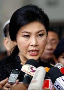 Thailand's Prime Minister Yingluck Shinawatra speaks to the media after a cabinet meeting in Bangkok