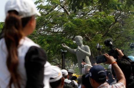 The media gathers around people as they light incense in prayer at the statue of the late Chea Vichea during the 10th anniversary of his death in Phnom Penh