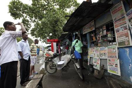 The media gathers around people as they light incense in prayer at the statue of the late Chea Vichea, former president of the Free Trade Union of the Workers of Cambodia, during the 10th anniversary of his death in Phnom Penh January 22, 2014. Chea Vichea was shot dead at a news stand in central Phnom Penh in January 2004. REUTERS/Samrang Pring (CAMBODIA - Tags: MEDIA POLITICS)