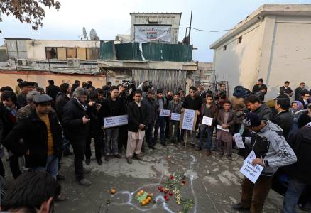 Members of media and civil society activists hold placards at a gathering outside a Lebanese restaurant that was attacked on Friday, in Kabul January 19, 2014. The gathering was aimed at commemorating those who died in the attack, which was carried out by a Taliban suicide bomber and gunmen, and as demonstration against terrorism. Twenty-one people, including three United Nations staff and the International Monetary Fund's top representative in Afghanistan, died in the attack. REUTERS/Omar Sobhani (AFGHANISTAN - Tags: CIVIL UNREST POLITICS CRIME LAW MEDIA)