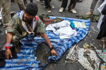 An anti-government protester shows the media the spot where an explosion took place near a camp of anti-government protesters at the Victory monument in central Bangkok