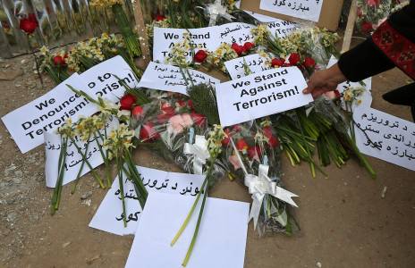 Members of media and civil society activists put flowers outside a Lebanese restaurant that was attacked on Friday, at a gathering, in Kabul