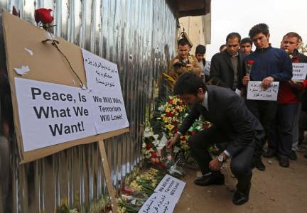 Members of media and civil society activists put flowers outside a Lebanese restaurant that was attacked on Friday, at a gathering, in Kabul January 19, 2014. The gathering was aimed at commemorating those who died in the attack, which was carried out by a Taliban suicide bomber and gunmen, and as demonstration against terrorism. Twenty-one people, including three United Nations staff and the International Monetary Fund's top representative in Afghanistan, died in the attack. REUTERS/Omar Sobhani (AFGHANISTAN - Tags: CIVIL UNREST POLITICS CRIME LAW MEDIA)