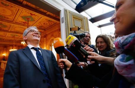 Wazir laughs as he answered journalists questions at the state parliament in Wiesbaden