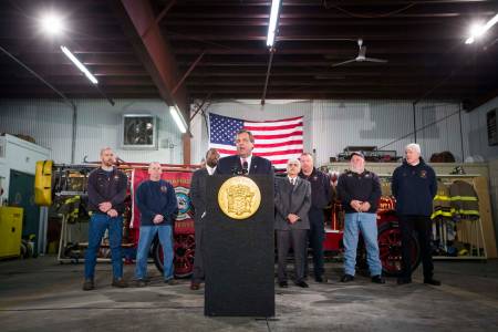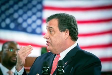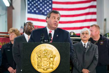 New Jersey Governor Chris Christie speaks to media and homeowners about the ongoing recovery from Hurricane Sandy in Manahawkin, New Jersey