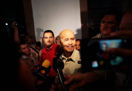 Michoacan's Governor Fausto Vallejo (C) walks surrounded by the media while visiting a townhouse in Apatzingan January 14, 2014. Vigilante groups battling a powerful drug cartel in a troubled region of Mexico on Tuesday rejected a government call to lay down their arms, raising the risk of a serious security challenge to President Enrique Pena Nieto. On Monday, Mexico's interior ministry ordered the heavily armed vigilantes to stop fighting the Knights Templar drug gang in the western state of Michoacan, where violent confrontations have converged on the city of Apatzingan in the last few days. Apatzingan is considered a stronghold of the Knights Templar, and over the past week, so-called self-defense groups have pushed to take control of surrounding towns and villages. The townhouse was set on fire on Sunday by members of the Knights Templar, according to local media. REUTERS/Jorge Dan Lopez (MEXICO - Tags: POLITICS CIVIL UNREST CRIME LAW MILITARY DRUGS SOCIETY)