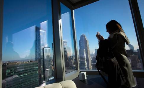 A journalist takes a photo out a window of a new hotel room in a Marriott Hotel in New York January 7, 2014. Marriott has built a combination Residence Inn and Courtyard by Marriott in the same 68 floor building making it the tallest, all hotel building in the U.S. REUTERS/Carlo Allegri (UNITED STATES - Tags: BUSINESS MEDIA)