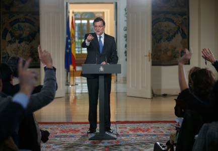 Spain's Prime Minister Mariano Rajoy points at journalists during a news conference after his last cabinet meeting at Moncloa palace in Madrid December 27, 2013. REUTERS/Andrea Comas (SPAIN - Tags: POLITICS MEDIA)