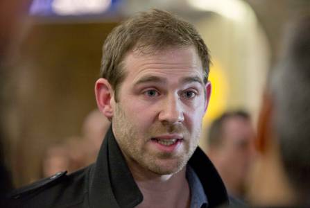 Canadian Greenpeace activist Alexandre Paul (L) speaks to the media as he arrives at the airport in Montreal, December 27, 2013. Paul was detained by Russia for more than three months following a protest against Arctic oil drilling in international waters. REUTERS/Christinne Muschi (CANADA - Tags: ENVIRONMENT CIVIL UNREST CRIME LAW)