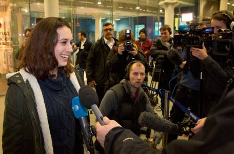 Greenpeace activist Alexandra Harris speaks to the media after arriving at St Pancras station in central London December 27, 2013. Four British Greenpeace activists and a video cameraman, who were imprisoned in Russia after being arrested in a protest over Arctic oil drilling, arrived back in London after being granted an amnesty by the Russian authorities. REUTERS/Neil Hall (BRITAIN - Tags: CIVIL UNREST POLITICS ENERGY ENVIRONMENT SOCIETY)