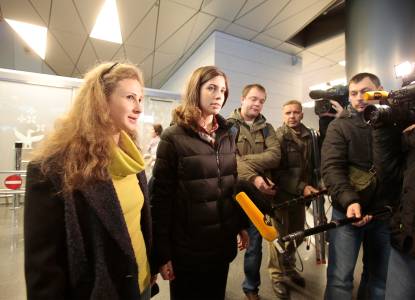 Pussy Riot members Tolokonnikova and Alyokhina talk to the media at Vnukovo airport in Moscow