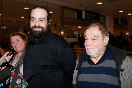 Canadian Greenpeace activist Alexandre Paul smiles as he meets the media with his parents after arriving in Montreal
