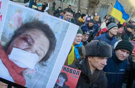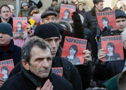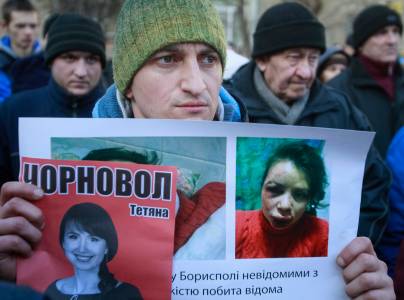 A protester holds a picture of journalist Chornovil during protest rally in front of the Ukrainian Ministry of Internal Affairs in Kiev