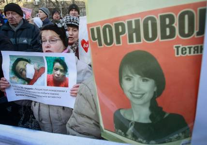 A protester holds pictures of journalist Chornovil during protest rally in front of the Ukrainian Ministry of Internal Affairs in Kiev