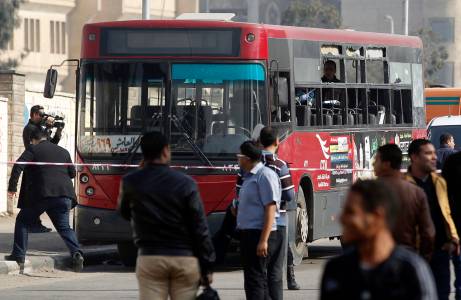 A member of the media films a damaged bus after a bomb blast near the Al-Azhar University campus in Cairo's Nasr City district