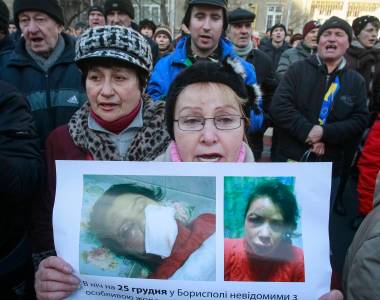 A protester (C) holds pictures of journalist Tetyana Chornovil, who was beaten and left in a ditch just hours after publishing an article on the assets of top government officials, during a protest rally in front of the Ukrainian Ministry of Internal Affairs in Kiev December 26, 2013. Protesters demanded Ukraine's interior minister resign on Thursday after an opposition journalist known for documenting the extravagance of the country's political elite was chased down in her car and savagely beaten in a midnight attack. REUTERS/Gleb Garanich (UKRAINE - Tags: POLITICS CIVIL UNREST CRIME LAW MEDIA)