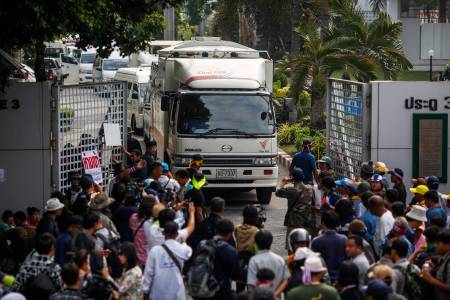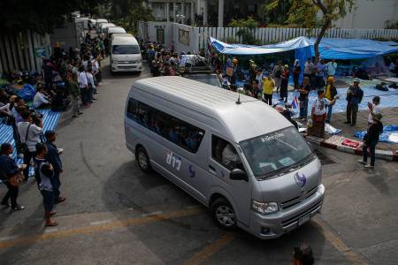 Media vans leave after anti-government protesters open the gate of The Thai-Japan youth stadium during a rally in Bangkok