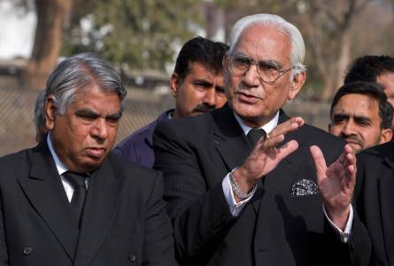 Ahmed Raza Kasuri, and Khalid Ranjha, lawyers of former Pakistani president Pervez Musharraf speaks to the media outside the court in Islamabad