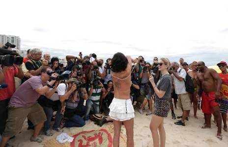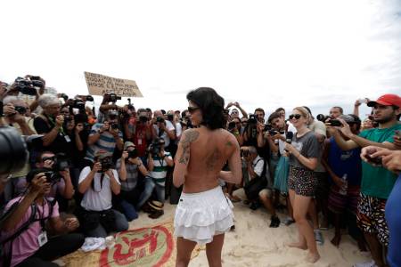 Media members surround a woman as she takes off her top as a protest, at Ipanema beach in Rio de Janeiro