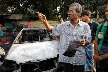 A man talks to the media after activists of Bangladesh Jamaat-E_Islami torched his vehicle during a clash with police in Dhaka