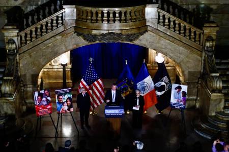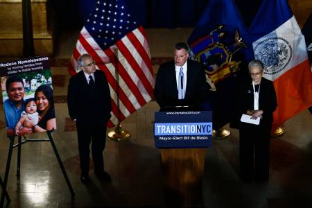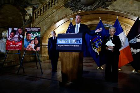 New York Mayor-elect Bill de Blasio (C) speaks to the media next to Lilliam Barrios-Paoli (R), newly appointed Deputy Mayor for Health and Human Services, and Anthony Shorris, First Deputy Mayor, during a news conference in New York, December 12, 2013. REUTERS/Eduardo Munoz (UNITED STATES - Tags: POLITICS HEALTH)