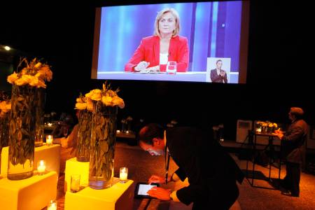 A member of the media attends a live televised debate between Chilean presidential candidates Michelle Bachelet and Evelyn Matthei in Santiago