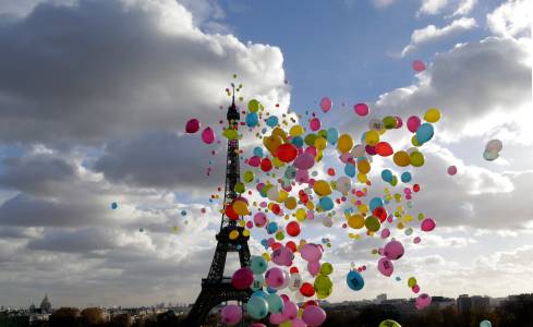 People release balloons into the air in front of the Eiffel Tower to support four French journalists who are held hostage in Syria, in Paris, December 6, 2013. Didier Francois, Edouard Elias, Pierre Torres and Nicolas Henin were captured in Syria on June 6 and June 22, 2013. REUTERS/Jacky Naegelen (FRANCE - Tags: POLITICS MEDIA)