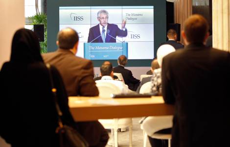 Media and delegation members watch U.S. Defense Secretary Hagel's speech from the lobby of Ritz Carlton Hotel, at the IISS Regional Security Summit - The Manama Dialogue, in Manama