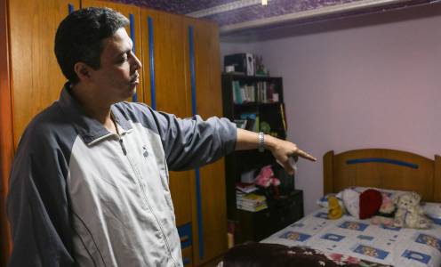 Ramadan Abdel Hamid, father of a girl who was found guilty of obstructing traffic during a pro-Islamist protest, points to his daughter's bed while speaking to journalists in his house in Alexandria December 6, 2013. Hamid's wife Salwa Mohamed, along with 13 other women and seven teenage girls including their 15-year-old daughter Rawda, were found guilty of obstructing traffic during the protest in October. The women were imprisoned for 11 years while the seven under the age of 18 were sent to juvenile prison. The first appeal session of the sentencing is on Saturday. Picture taken December 6, 2013. REUTERS/Stringer (EGYPT - Tags: POLITICS CRIME LAW CIVIL UNREST)