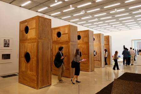 Journalists view a work titled "Moon Chest" by artist Ai Weiwei of China during a media tour of the Perez Art Museum Miami (PAMM) in Miami, Florida