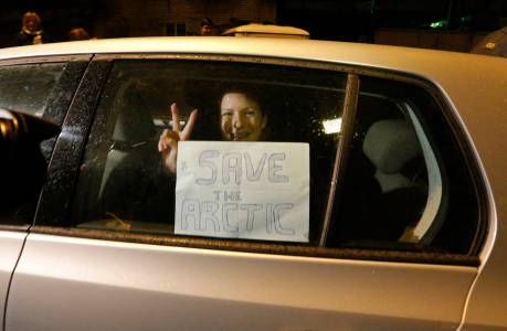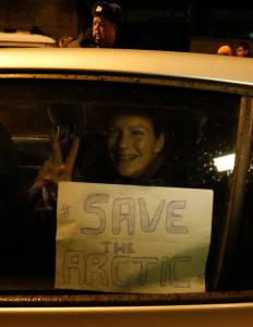 Greenpeace activist Paula from Brazil gestures to the media from a car after she was released from prison in St. Petersburg