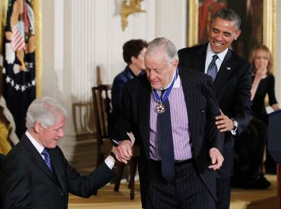 Journalist Bradlee is helped to his seat by former U.S. president Clinton and U.S. President Obama after he was presented the Presidential Medal of Freedom in Washington