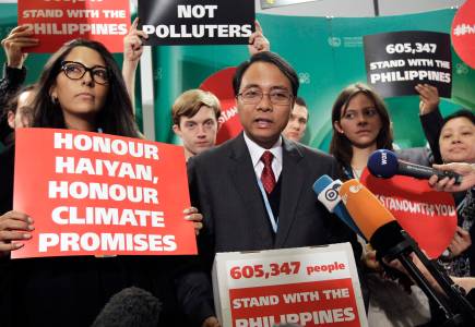 Sano, the Philippines' climate commissioner talks with media during the United Nations COP19 in Warsaw
