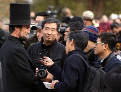 A re-enactor portraying U.S. President Lincoln is interviewed by Japanese journalists at Gettysburg National Cemetery in Pennsylvania