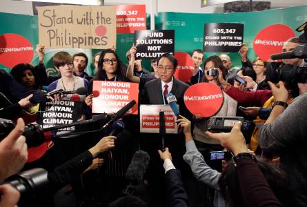 Naderev Sano (C), the Philippines' climate commissioner, (C) talks with media during the 19th conference of the United Nations Framework Convention on Climate Change (COP19) at the National Stadium in Warsaw November 19, 2013. Sano accepted a petititon with over 600,000 signatures from an online campaign group calling for devleoped countries to increase their climate controls, honour their finance promises and adopt a loss and damage mechanism to deal with climate impacts like typhoon Haiyan. REUTERS/Kacper Pempel (POLAND - Tags: POLITICS ENVIRONMENT BUSINESS)