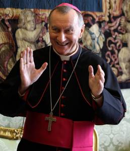 Vatican Secretary of State Archbishop Pietro Parolin greets journalists during his meeting with Bahamas Premier Perry Christie at the Vatican November 18, 2013. REUTERS/Gregorio Borgia/Pool (VATICAN - Tags: RELIGION MEDIA)