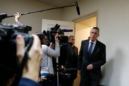 Paris prosecutor Francois Molins (R) is surrounded by journalists as he arrives to attend a news conference in Paris November 18, 2013. Police were hunting a lone gunman on the loose in central Paris on Monday after he opened fire at the offices of left-wing daily newspaper Liberation and a major bank before hijacking a car to take him to the Champs-Elysees avenue. The shaven-haired assailant, who police said was filmed by video-surveillance cameras, fired shots at the office of Liberation daily, seriously injuring a photographer's assistant before fleeing, police and staff at the newspaper said. REUTERS/Gonzalo Fuentes (FRANCE - Tags: CRIME LAW MEDIA)