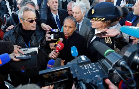 French Justice Minister Christiane Taubira (C) speaks with journalists after the ceremony to lay the first stone of the Baumettes 2 prison in Marseille November 14, 2013. REUTERS/Jean-Paul Pelissier (FRANCE - Tags: POLITICS MEDIA)