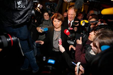 Lille Mayor Martine Aubry is surrounded by journalists as she leaves after a meeting at luxury and sports brands group Kering headquarters in Paris, November 12, 2013. French luxury group Kering announced significant job cuts as part of a restructuring at its loss-making La Redoute mail order business, which it is trying to sell. REUTERS/Benoit Tessier (FRANCE - Tags: POLITICS BUSINESS EMPLOYMENT MEDIA)