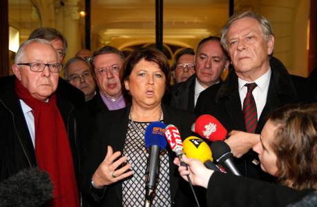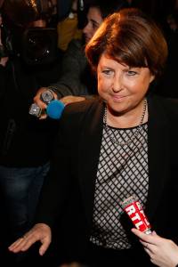 Lille Mayor Martine Aubry answers journalists as she leaves after a meeting at luxury and sports brands group Kering headquarters in Paris, November 12, 2013. French luxury group Kering announced significant job cuts as part of a restructuring at its loss-making La Redoute mail order business, which it is trying to sell. REUTERS/Benoit Tessier (FRANCE - Tags: POLITICS BUSINESS EMPLOYMENT MEDIA)