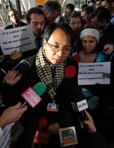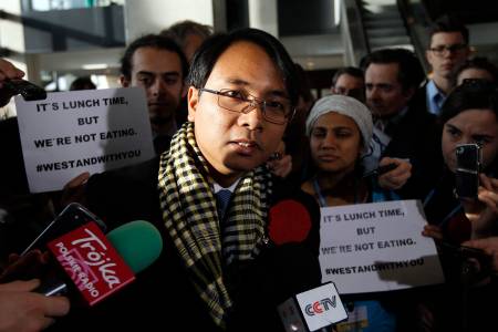Sano, the Philippines' Climate Commissioner, talks with the media as he begins a voluntary fast during the 19th conference of the United Nations Framework Convention on Climate Change in Warsaw
