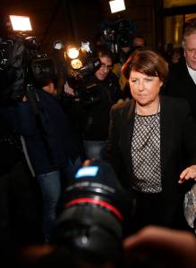 Lille Mayor Martine Aubry is surrounded by journalists as she leaves after a meeting at luxury and sports brands group Kering headquarters in Paris, November 12, 2013. French luxury group Kering announced significant job cuts as part of a restructuring at its loss-making La Redoute mail order business, which it is trying to sell. REUTERS/Benoit Tessier (FRANCE - Tags: POLITICS BUSINESS EMPLOYMENT MEDIA)