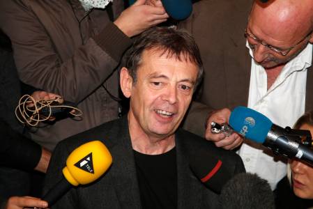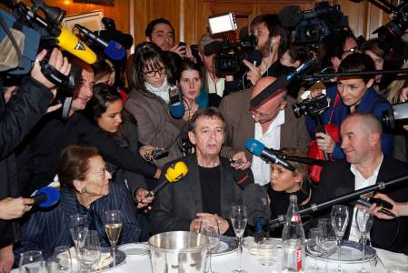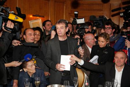 French author Pierre Lemaitre is surrounded by journalists as he arrives at the Drouant restaurant in Paris after he received the literary Goncourt Prize