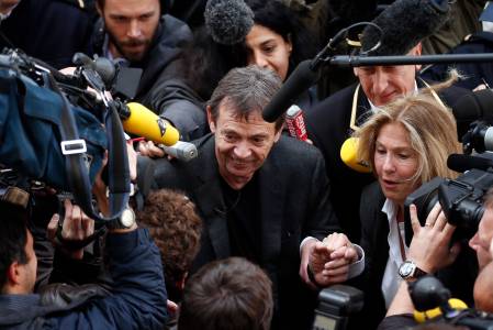 French author Pierre Lemaitre (C) is surrounded by journalists as he arrives at the Drouant restaurant in Paris November 4, 2013 after he received the literary Goncourt Prize for his novel "Au revoir la-haut". REUTERS/Benoit Tessier (FRANCE - Tags: ENTERTAINMENT SOCIETY MEDIA)