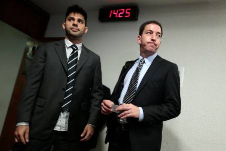 Glenn Greenwald (R), the American journalist who first published the documents leaked by former NSA contractor Edward Snowden, arrives with partner David Miranda to testify in front of the Brazilian Federal Senate's Parliamentary Inquiry Committee, established to investigate allegations of spying by United States on Brazil, in Brasilia in this October 9, 2013 file photo. British authorities claimed Miranda was involved in "terrorism" when he tried to carry documents from Snowden through a London airport in August, according to police and intelligence documents. REUTERS/Ueslei Marcelino/Files (BRAZIL - Tags: POLITICS MEDIA)