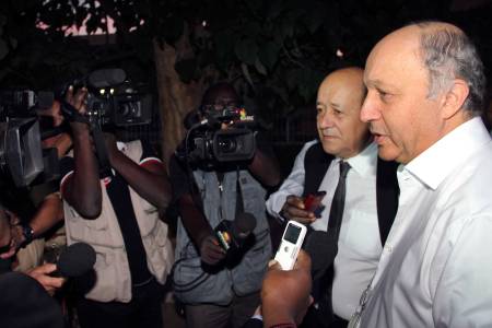 French Foreign Minister Laurent Fabius (R) and Defense Minister Jean-Yves Le Drian (2nd R) take questions from journalists at the airport in Niamey October 30, 2013. Four Frenchmen, Pierre Legrand, Daniel Larribe, Thierry Dol and Marc Feret, held hostage in the Sahara desert by al Qaeda-linked gunmen for three years left Niger on a French government plane on Wednesday, with questions raised in France over whether a ransom had been paid. The men, kidnapped in 2010 while working for French nuclear group Areva and a subsidiary of construction group Vinci in northern Niger, were freed on Tuesday after secret talks. REUTERS/Djibo Tagaza (NIGER - Tags: POLITICS CIVIL UNREST MILITARY CRIME LAW)